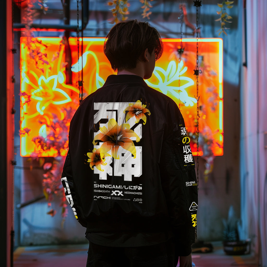 The DEATH CODE Bomber merges cyberpunk rebellion with Japanese streetwear precision. Built from a sleek black shell with bold white and neon-blue graphic overlays, this jacket is more than clothing...