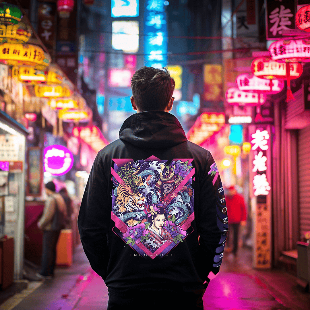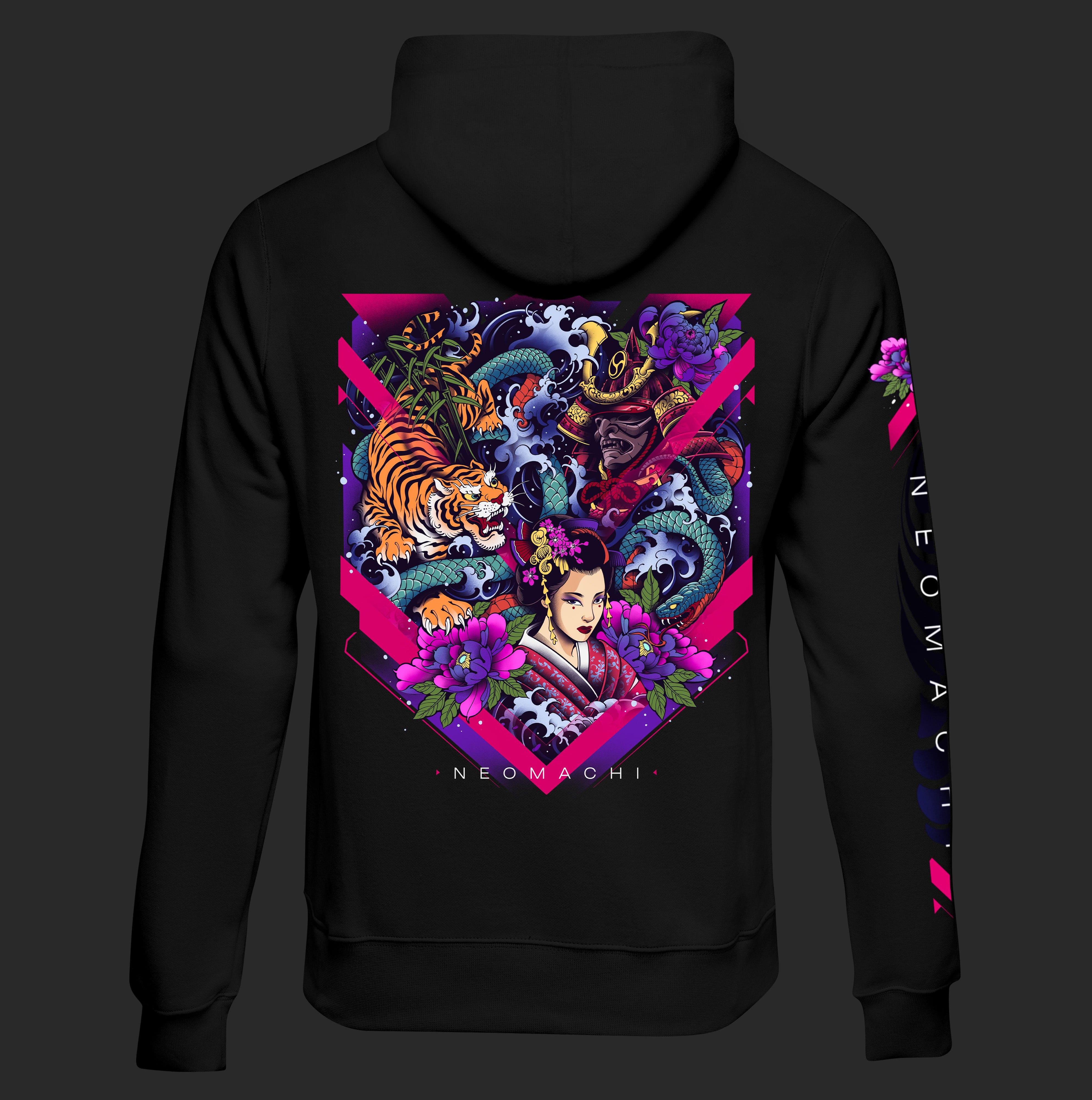 Our BUNSHIN zip hoodie makes Japanese Irezumi wearable on your clothes, instead of having to make a lifelong tattoo commitment. Featuring an intricate design with elements like the geisha, samurai mask, snake, and lotus flowers, this hoodie adds a touch of elegance and symbolism to your outfit.