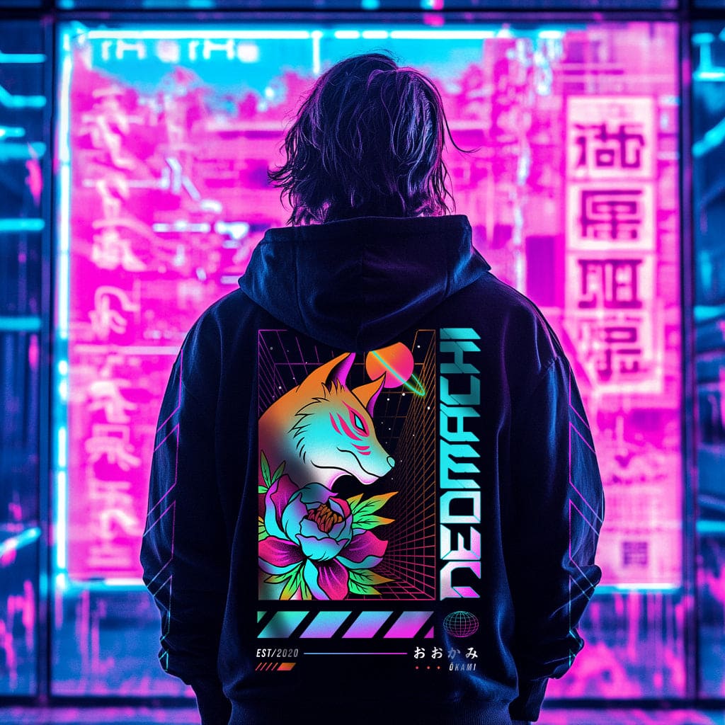 Ōkami means wolf, from Japanese mythology and Folklore. With our latest design, we Cyberpunk'ed up traditional Japanese themes, like we usually love to do at Neomachi. With our ŌKAMI hoodie, you're ready to leave the 2020's behind and step into 2077! This design is also available in a t-shirt, bomber, and sweater version.