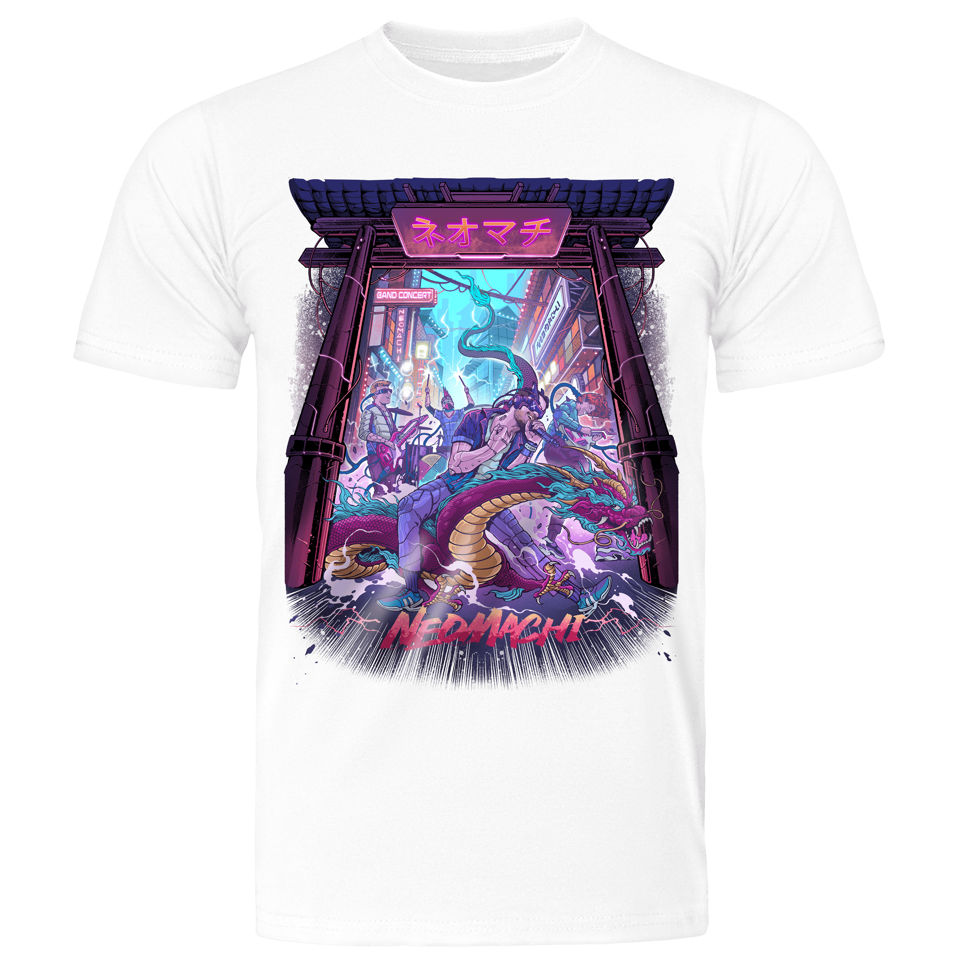 Step into a futuristic Asian-inspired alley illuminated by mesmerizing neon lights with our Ongaku design. This cyberpunk band setting captures the essence of a world where technology and urban culture collide. Prepare to be immersed in the intricate details that bring this design to life and transport you to a realm of electrifying music and pulsating energy. Don't miss the chance to rock this unique style that's also available in a hoodie and sweater version.