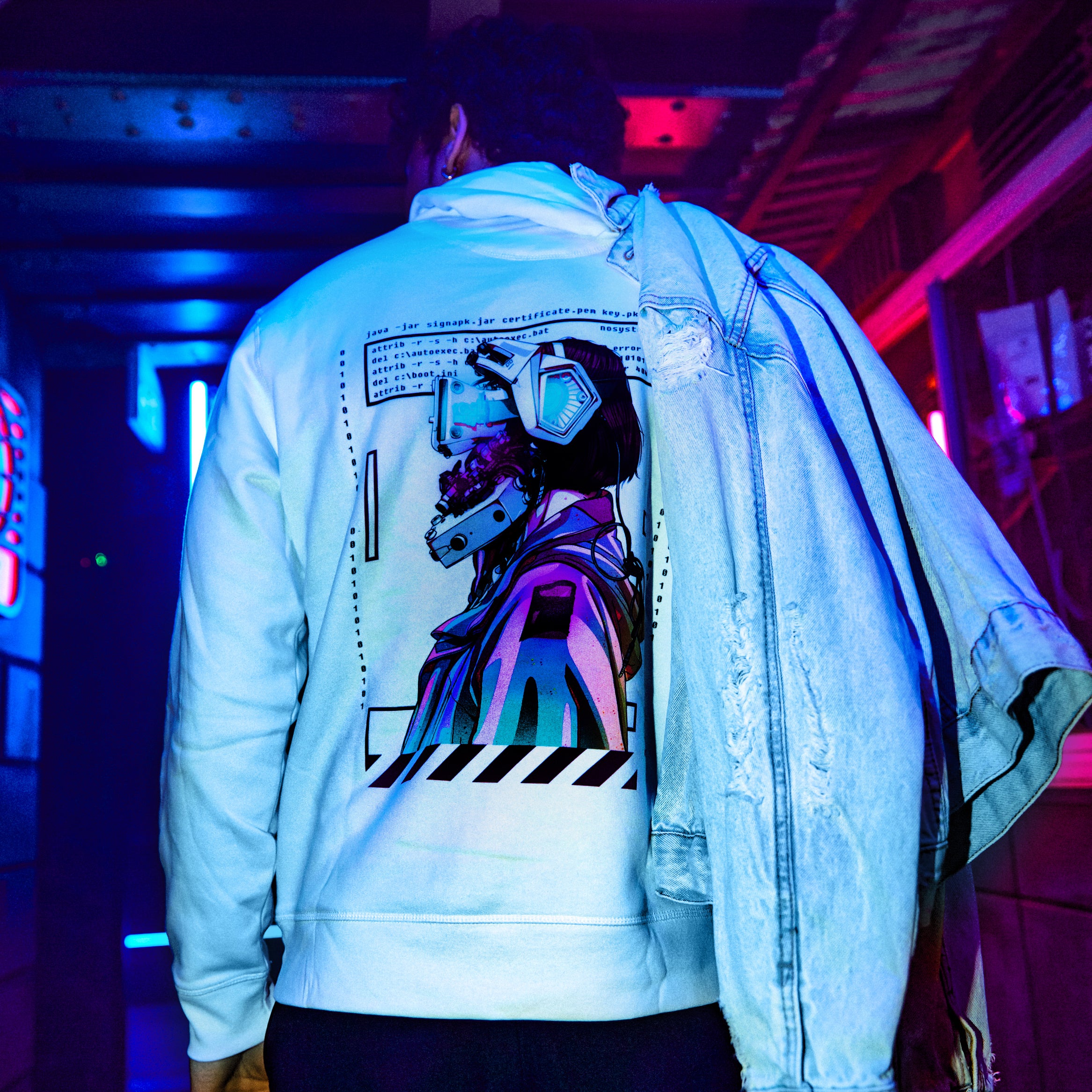 This warm fleece-lined hoodie has quite a fitted/slim cyberpunk style. Your regular size will most likely fit, but if you want to go for a more baggy, relaxed, or comfortable look, we suggest taking one size larger.