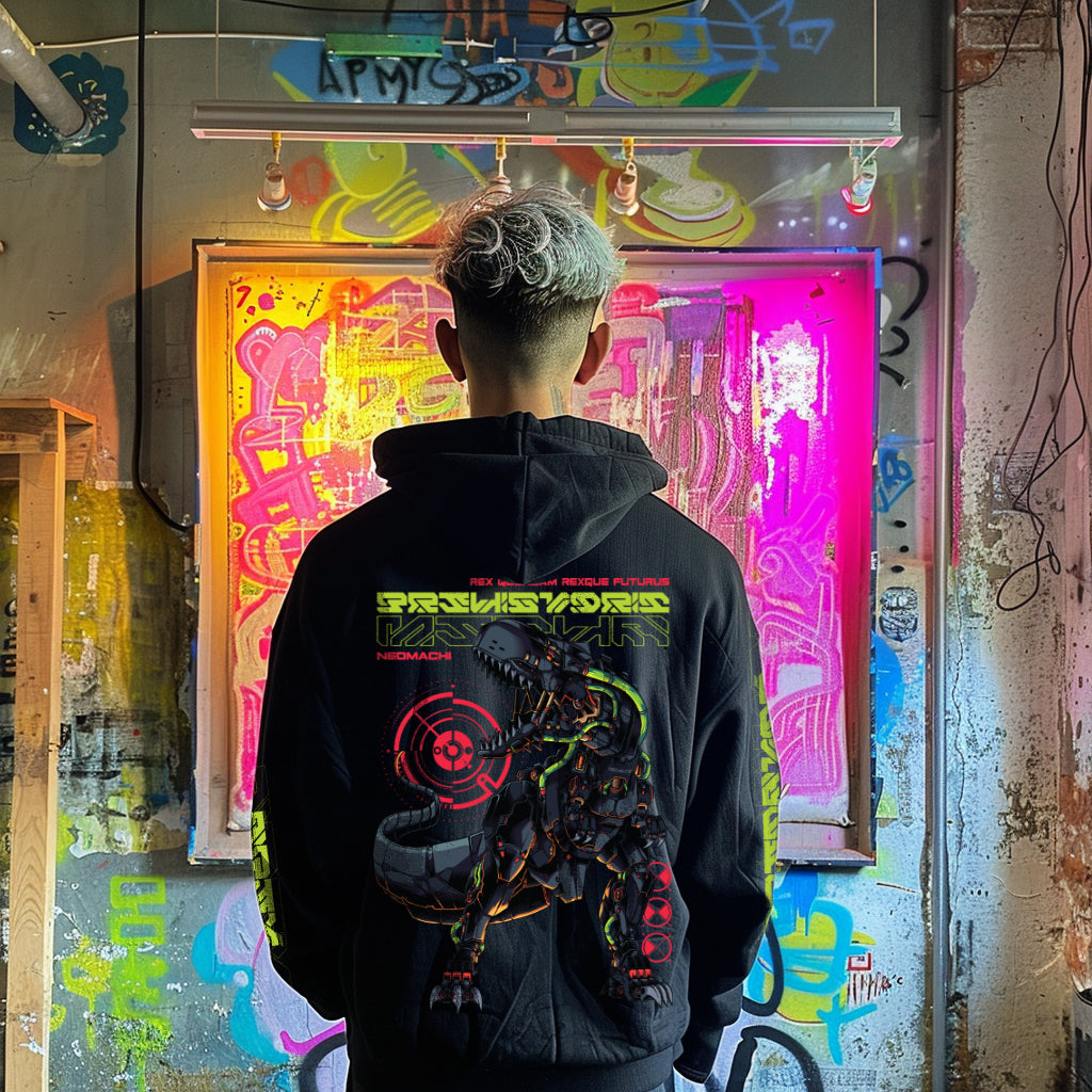 Unleash the power of both the past and the future with our exclusive T-Rex design. Featuring a stunning, high-definition graphic of a mecha Tyrannosaurus Rex, this hoodie perfectly captures the essence of an ancient ruler reborn into a futuristic titan. The intricate design showcases the T-Rex in a cybernetic form, blending the raw power of the prehistoric era with advanced, cutting-edge technology. The phrase "Rex Quondam Rexque Futurus," meaning "The Once and Future King" in Latin, symbolizes the T-Rex's timeless reign and future dominance.